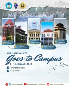 Melalui program Goes to Campus, SMA Nasional KPS menghadirkan pengalaman belajar yang tidak hanya terbatas di ruang kelas, tetapi juga langsung terhubung dengan dunia pendidikan tinggi. Dalam kegiatan ini, siswa-siswi berkesempatan mengikuti rangkaian University Tour dan City Tour ke berbagai perguruan tinggi ternama di Indonesia, seperti Universitas Indonesia, Institut Teknologi Bandung, Universitas Gadjah Mada, Institut Teknologi Sepuluh Nopember, serta Universitas Brawijaya.